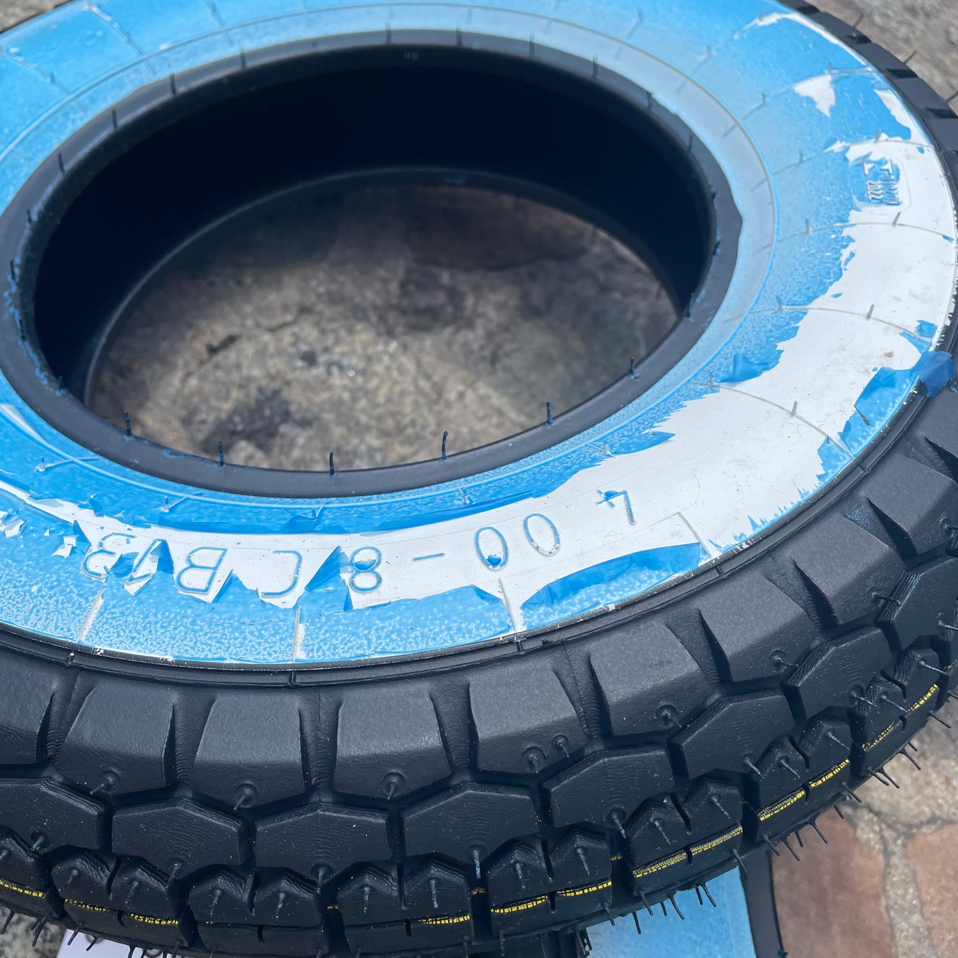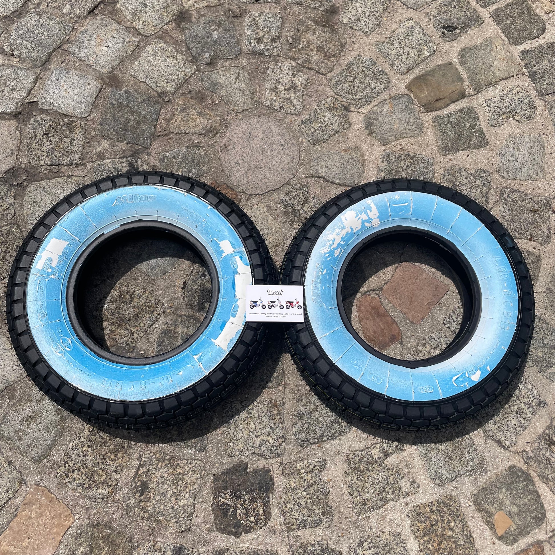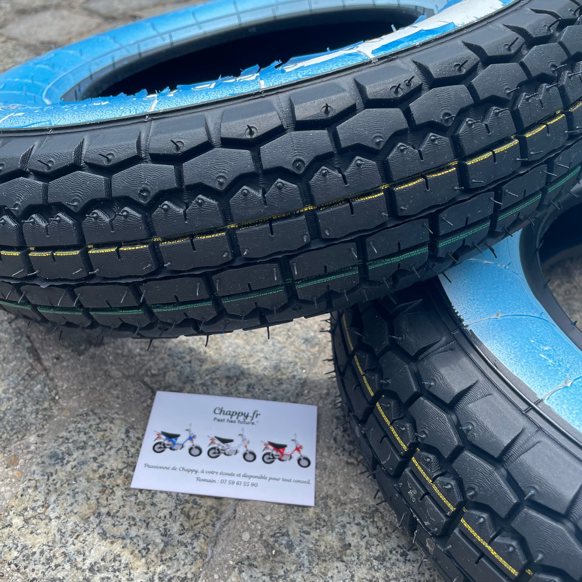Pneu neuf à flanc blanc taille d'origine pour Chappy. Prix pour un seul pneu.